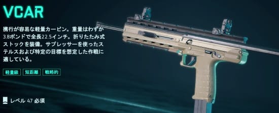 VCARは持ち運びが簡単な軽量の武器。重量はわずか1.72kgと軽い上に全長22,5インチと小さい。折りたたみ形式のストックが取り付けられている。サプレッサーを使った暗殺作戦に適している武器らしい。